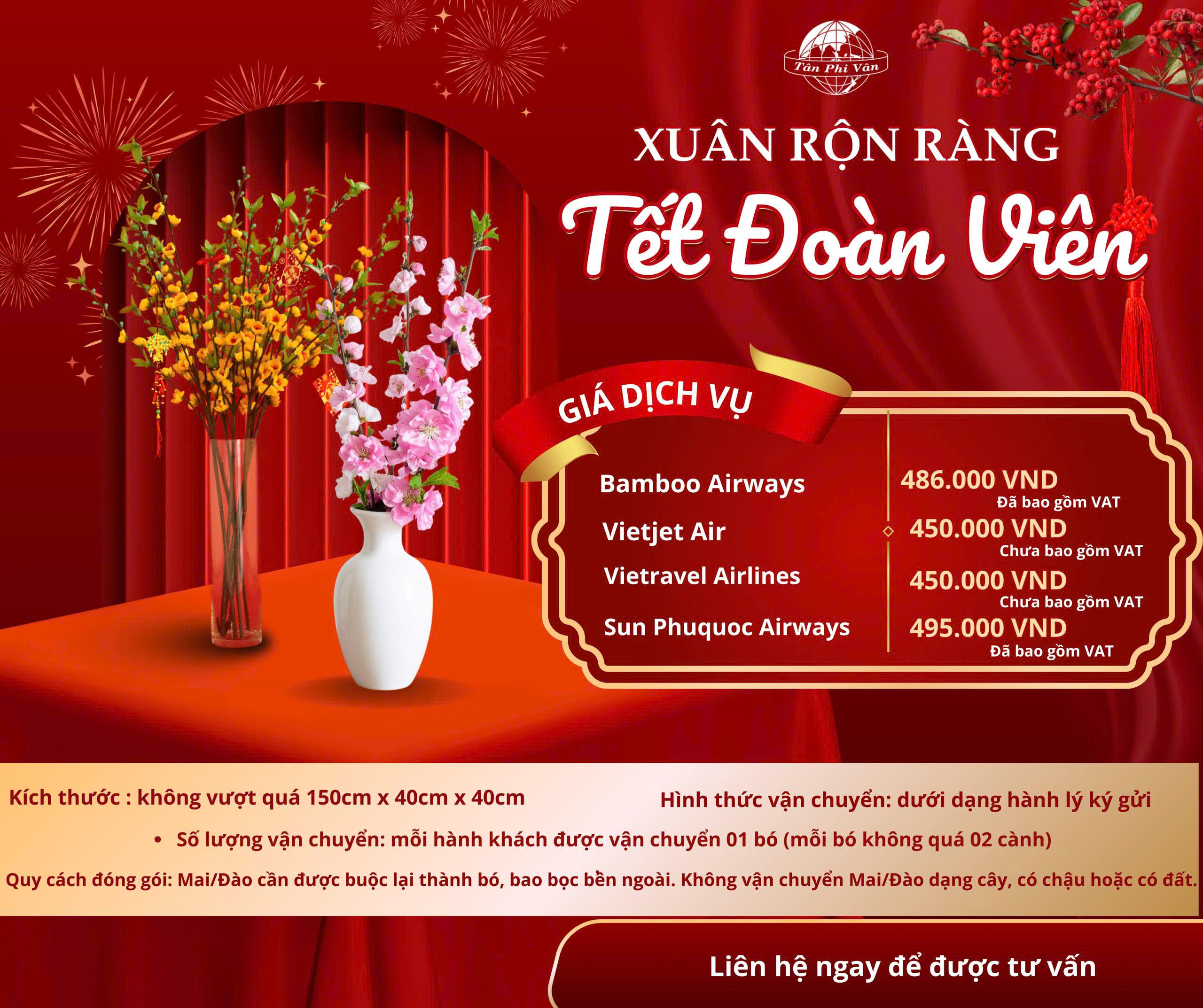 Đại lý vé máy bay Tân Phi Vân xin cập nhật thông tinNhằm đáp ứng nhu cầu vận chuyển Mai/Đào trong cao điểm Tết, Tân Phi Vân chính thức triển khai dịch vụ vận chuyển theo hình thức hành lý ký gửi trên các hãng: