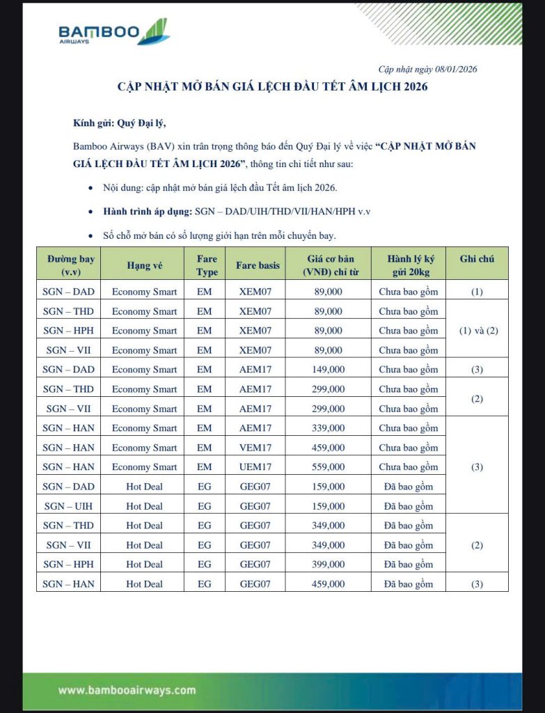 Đại lý vé máy bay Tân Phi Vân xin update thông báo hãng hàng không BAMBOO AIRWAYS CẬP NHẬT MỞ BÁN GIÁ LỆCH ĐẦU TẾT ÂM LỊCH 2026
