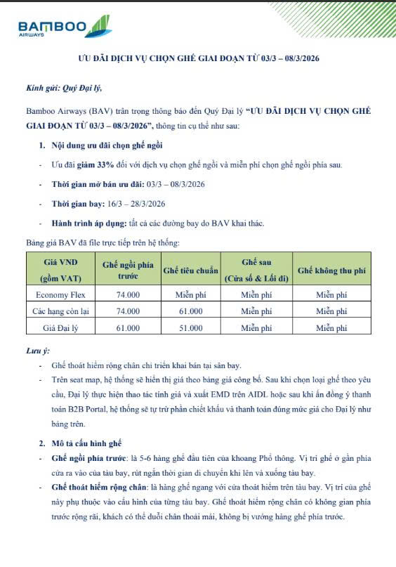 Đại lý vé máy bay Tân Phi Vân xin update thông báo hãng hàng không BAMBOO AIRWAYS THÔNG BÁO ƯU ĐÃI DỊCH VỤ CHỌN GHẾ GIAI ĐOẠN TỪ 03/3 – 08/3/2026