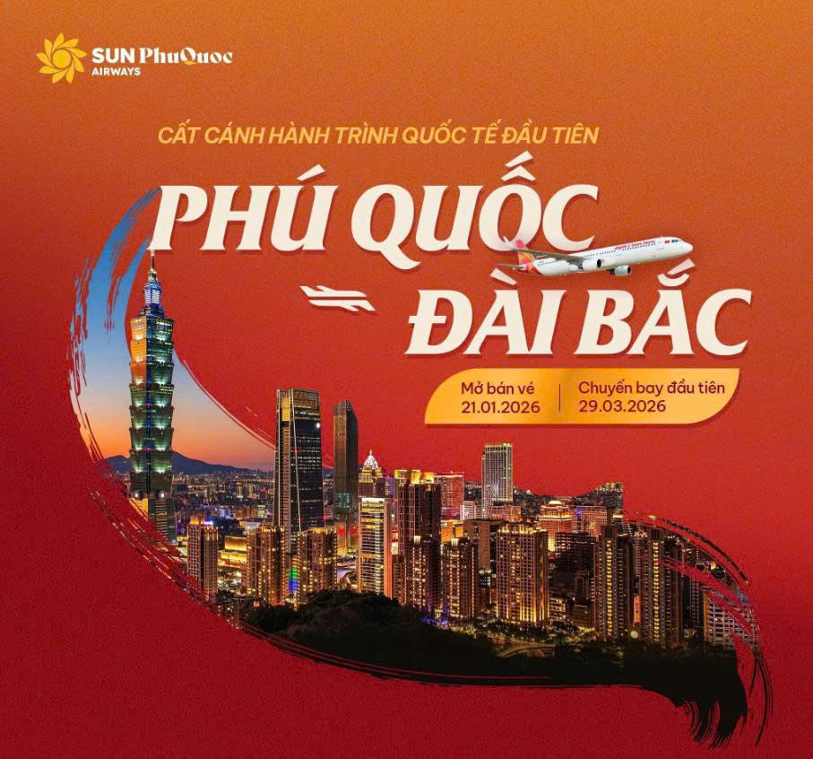 Đại lý vé máy bay Tân Phi Vân xin update thông báo hãng hàng không Sun PhuQuoc Airways hân hoan chào đón đường bay quốc tế mới, kết nối trực tiếp Phú Quốc và Đài Bắc chính thức mở bán từ ngày 21/1/2026!