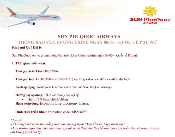 Đại lý vé máy bay Tân Phi Vân xin update thông báo hãng hàng không Sun PhuQuoc Airways THÔNG BÁO VỀ CHƯƠNG TRÌNH 08/03 – QUỐC TẾ PHỤ NỮ