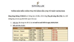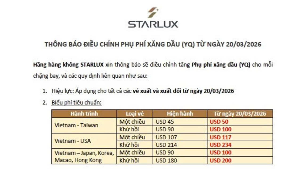 Đại lý vé máy bay Tân Phi Vân xin update thông báo hãng hàng không STARLUX Airlines xin thông báo về việc điều chỉnh phụ phí xăng dầu (YQ) như sau: Áp dụng cho: Tất cả vé xuất mới hoặc đổi vé. Hiệu lực: Từ ngày 20/03/2026