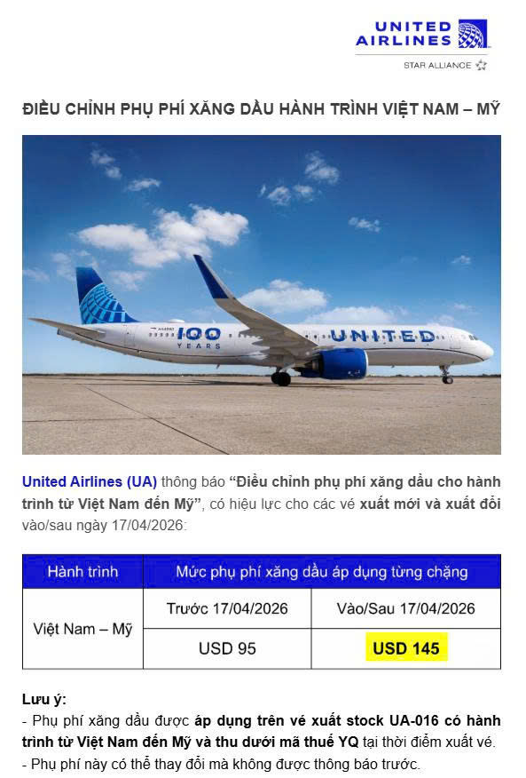 TPV – United Airlines Vietnam – ĐIỀU CHỈNH PHỤ PHÍ XĂNG DẦU HÀNH TRÌNH VIỆT NAM – MỸ
