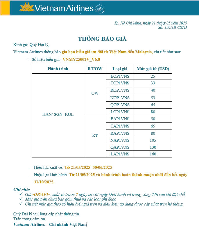 Đại lý vé máy bay Tân Phi Vân xin update thông báo hãng hàng không Vietnam Airlines GIA HẠN BIỂU GIÁ ƯU ĐÃI TỪ VIỆT NAM ĐẾN MALAYSIA- HL 21.05-30.06.2025