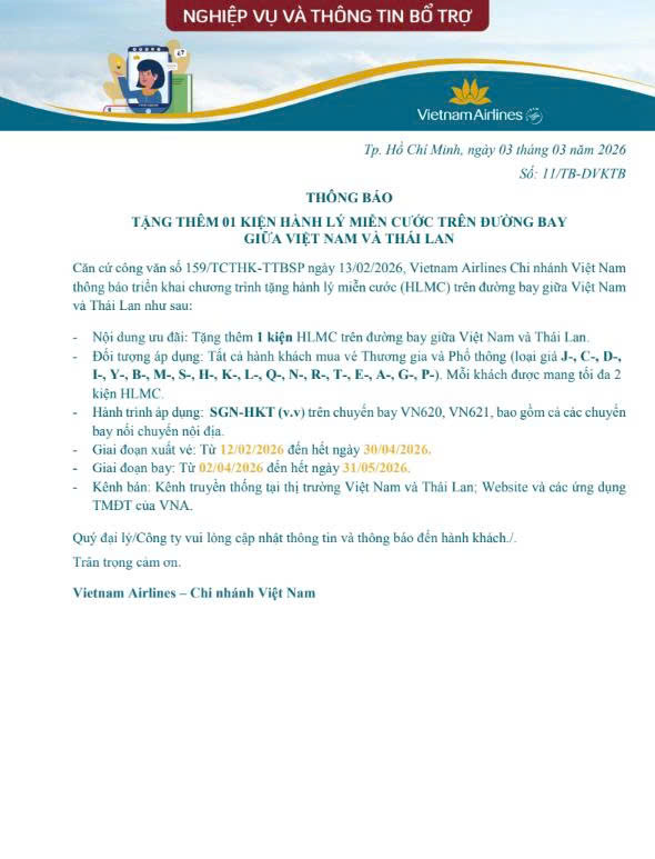 Đại lý vé máy bay Tân Phi Vân xin update thông báo hãng hàng không VIETNAM AIRLINES TẶNG THÊM 1 KIỆN HLMC TRÊN ĐƯỜNG BAY VIỆT NAM – THÁI LAN