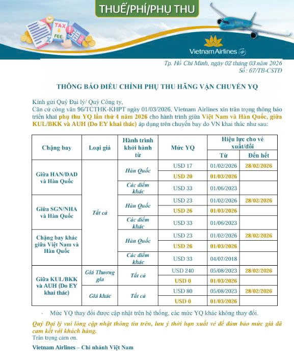 Đại lý vé máy bay Tân Phi Vân xin update thông báo hãng hàng không VIETNAM AIRLINES THUẾ/PHÍ] YQ4.2026_Triển khai điều chỉnh phụ thu YQ giữa VN_KR; giữa KUL,BKK và AUH (Do EY khai thác) – HL 01.03.2026