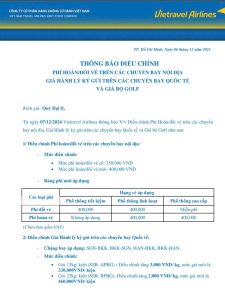 TPV – VU – THÔNG BÁO ĐIỀU CHỈNH PHÍ HOÀN ĐỔI VÉ TRÊN CÁC CHUYẾN BAY NỘI ĐỊA – GIÁ HÀNH LÝ KÝ GỬI TRÊN CÁC CHUYẾN BAY QUỐC TẾ VÀ BỘ GOLF
